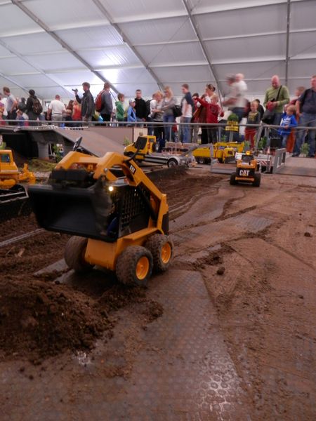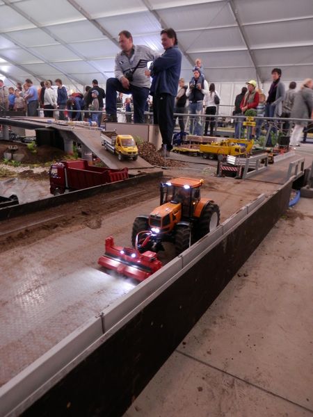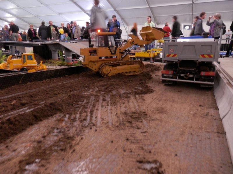 Model Hobby 27.-30.09.12Letošní pražský veletrh nezklamal pověst největší akce roku a na obrovské ploše vytvořené ze tří silnic, dvou stavenišť, tří mostů, tří skladišť a několika parkovišť bylo opět možné sledovat spousty strojů a vozidel neúnavně pracujících od rána do večera. Letos mělo dojít i na pokládku kanalizace, ale kvůli technickým potížím s jeřábem došlo jen na provádění výkopu a jeho zavážení, což byla celkem riziková činnost. V jednu chvíli se tu sešlo dokonce devět funkčních sklopek včetně agrovky, kontejnerovky a ještě traktorů s vlekem, takže stavební stroje mohly naplno pracovat a hliněný polygon byl za chvíli rozkopaný křížem krážem. Dakaristi, kteří se sešli v hojném počtu, konečně měli vlastní polygon a sesbírali i několik medajlí. Jen provoz ve skladu vázl a ožil až v neděli, protože skladník-střídač makal na sklopce od bagrem a na ještěrku už nezbyl čas.