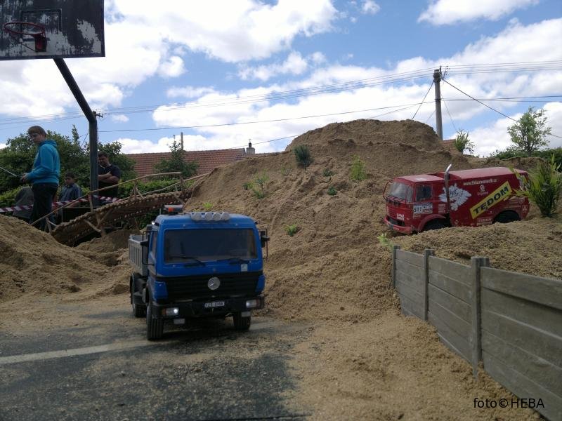 Horní Ředice sportovní den 09.06.12Byl jsem požádán organizátorkou sportovního dne v Horních Ředicích, zda by bylo možné zajistit doprovodný program s modely kamionů. Jelikož všechny ostatní kluby a skupiny měli nějakou akci, sehnal jsem ještě několik dalších modelářů a dorazili jsme na místo, kde jsme společně začali připravovat určený prostor. To bylo bez klubových silnic o něco složitější, ale pomocí smetáku, pásky, koberců, plotů, popruhu a hlíny se nám podařilo vytvořit plochu se dvěma skladišti, parkovištěm a pískem ohraničenou cestami. Pak už nic nemohlo (kromě vyjasnění přednosti v jízdě) bránit modelům v provozu a tak se na improvizovaných cestách proháněly kamiony, náklaďáky, traktor a občas i osobní vozy. Později došlo i na další prosbu organizátorů a to půjčování modelů dětem. Ze začátku se většina zájemců snažila udržet zapůjčené vozidlo na cestě a přitom jezdit ohleduplně, ale postupem času se někteří zvrhli v piráty silnic a to už bylo potřeba zakročit odebráním vysílače. Naštěstí kromě jedné vážnější nehody v nepřehledné zatáčce k výraznějším obětem na modelech nedošlo. Nezbývá než poděkovat všem zůčastněným a těšit se na další podobné akce. Bohužel jsem zapoměl doma foťák tak fotky jen od kolegy: